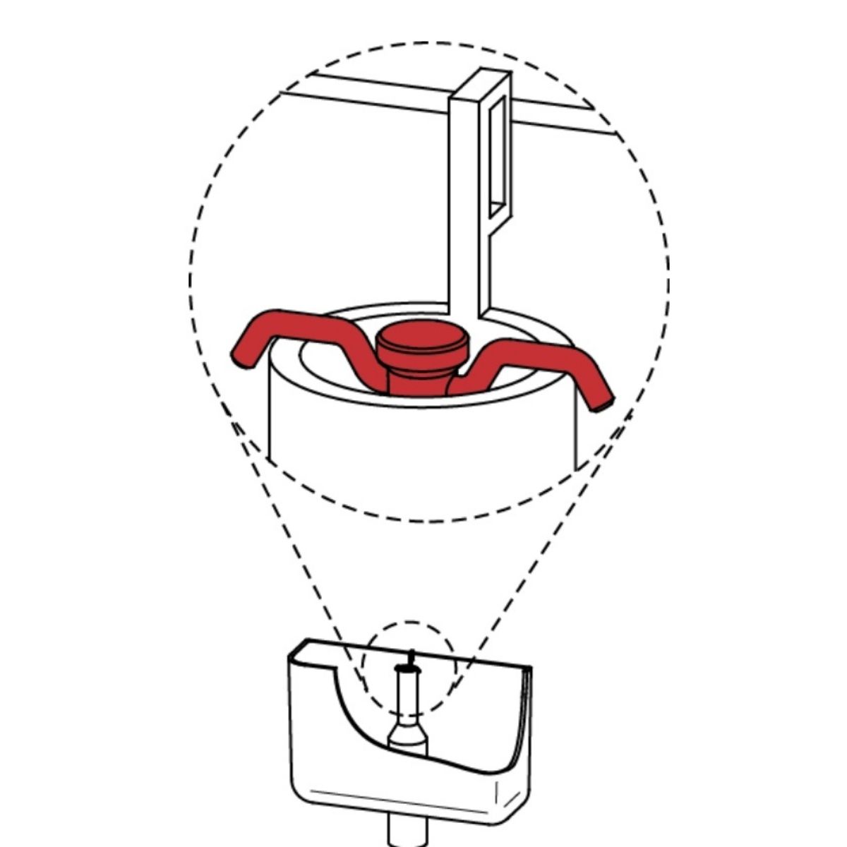 El RCM WC Stop se cuelga en el tubo de rebose. Su propio peso garantiza que, al soltar el botón de descarga, la válvula de salida se cierre de inmediato.